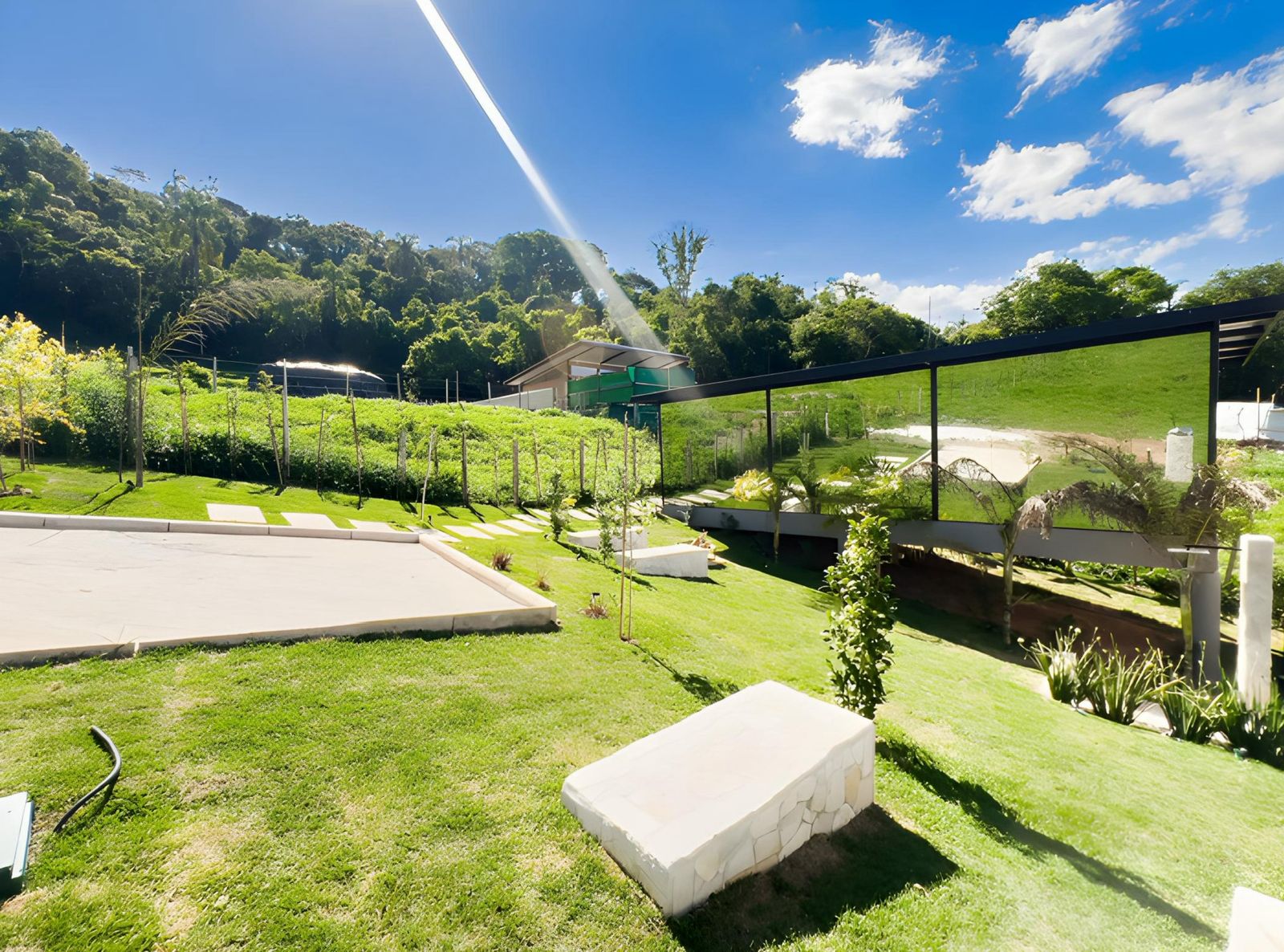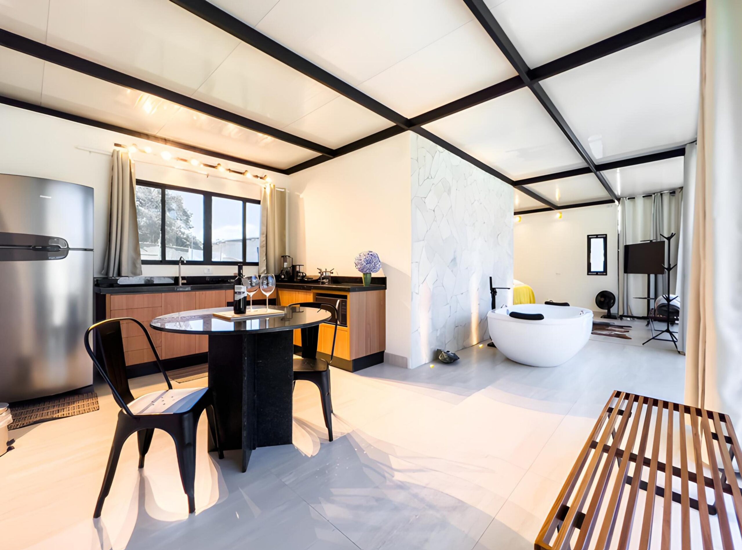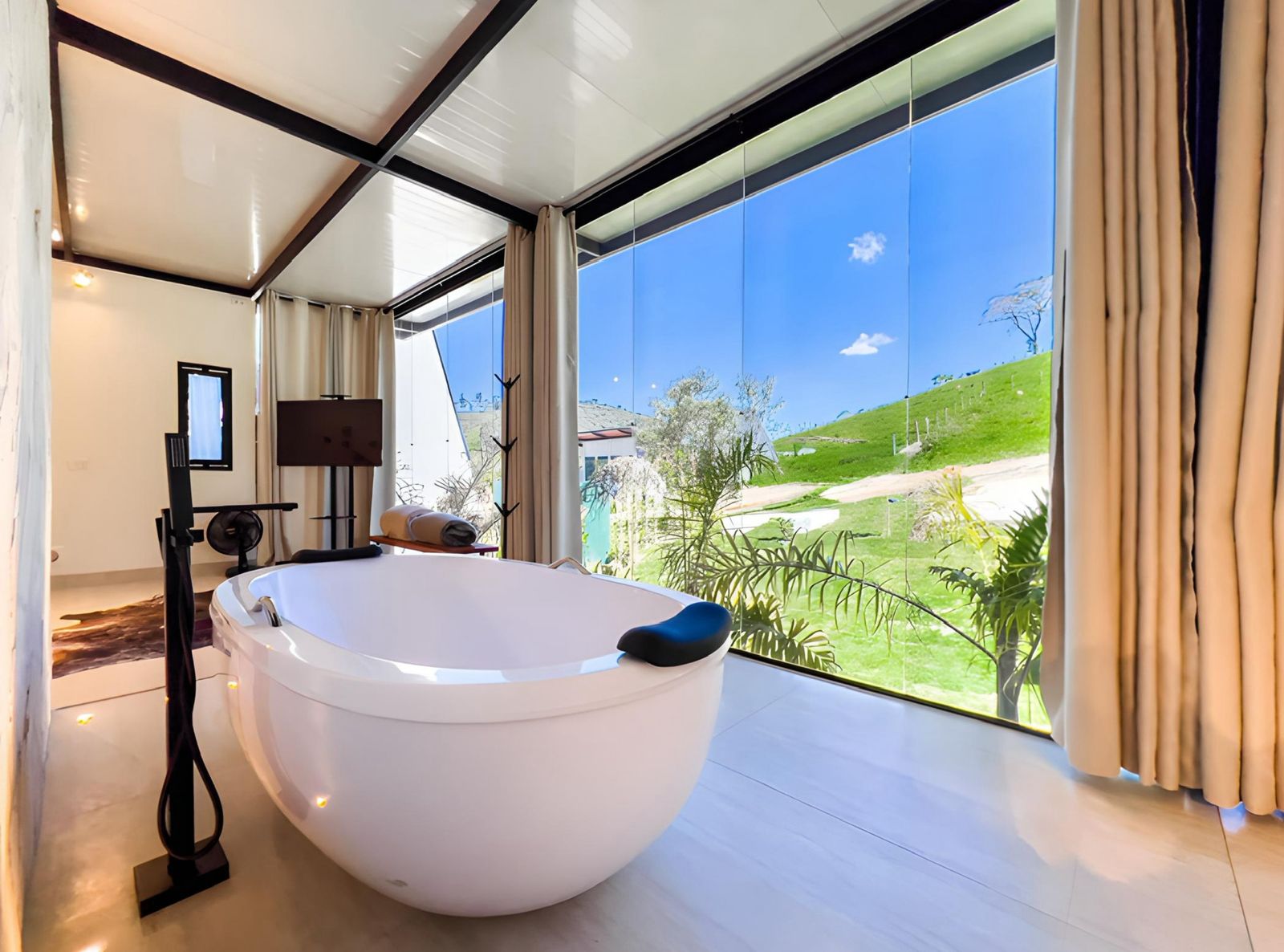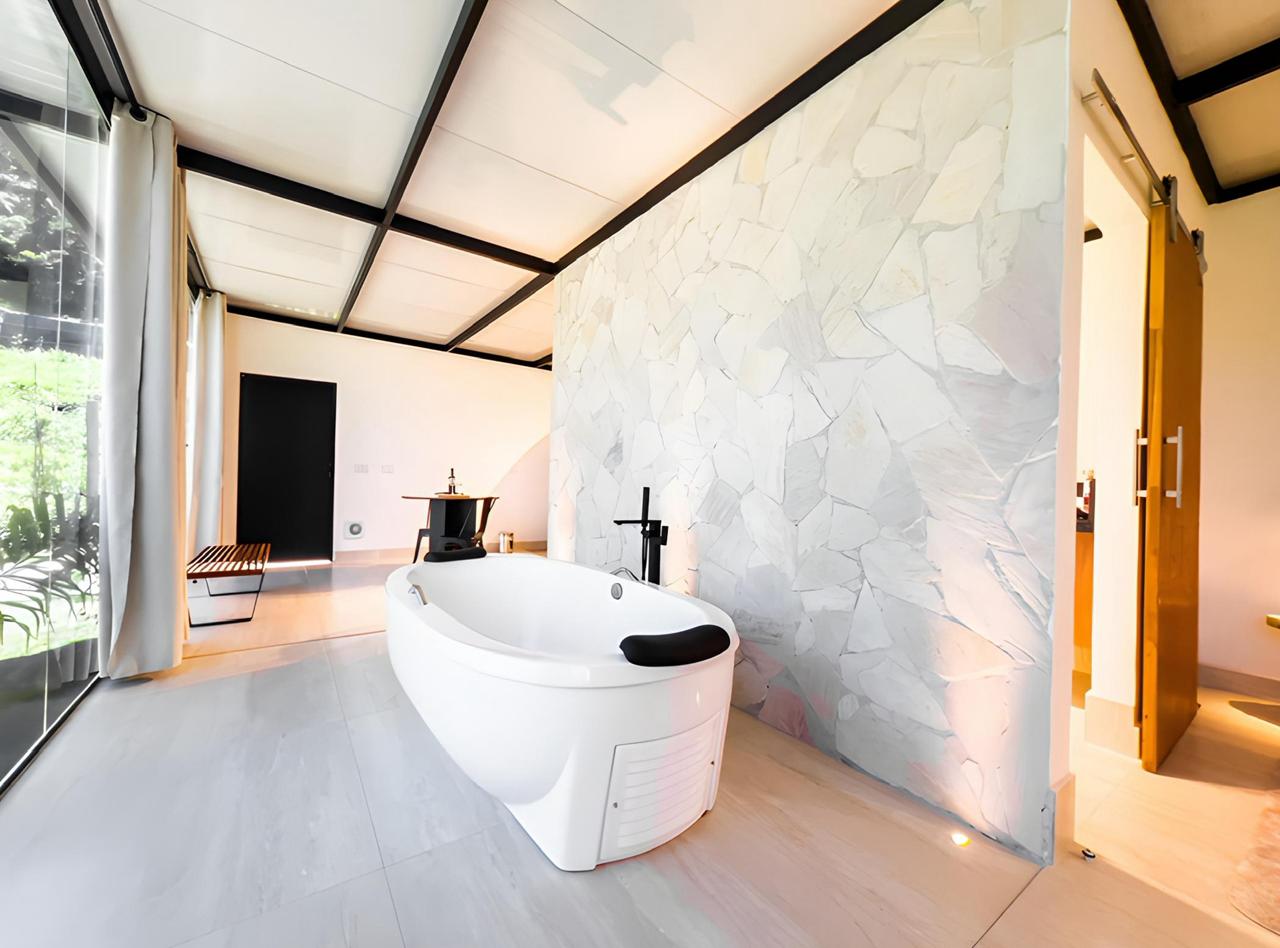 A banheira de imersão é um dos grandes destaques, ideal para relaxar em um ambiente silencioso e privativo. Para maior autonomia, a cozinha completa permite preparar refeições com facilidade, enquanto a ducha externa e a lareira externa oferecem momentos agradáveis ao ar livre.